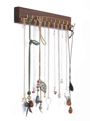 Fabriqué en bois massif de haute qualité et équipé de crochets métalliques dorés, ce présentoir mural combine solidité et raffinement. Ses crochets alignés permettent d’accrocher facilement colliers, pendentifs, bracelets ou accessoires de mode tout en évitant les nœuds et en préservant leur éclat.